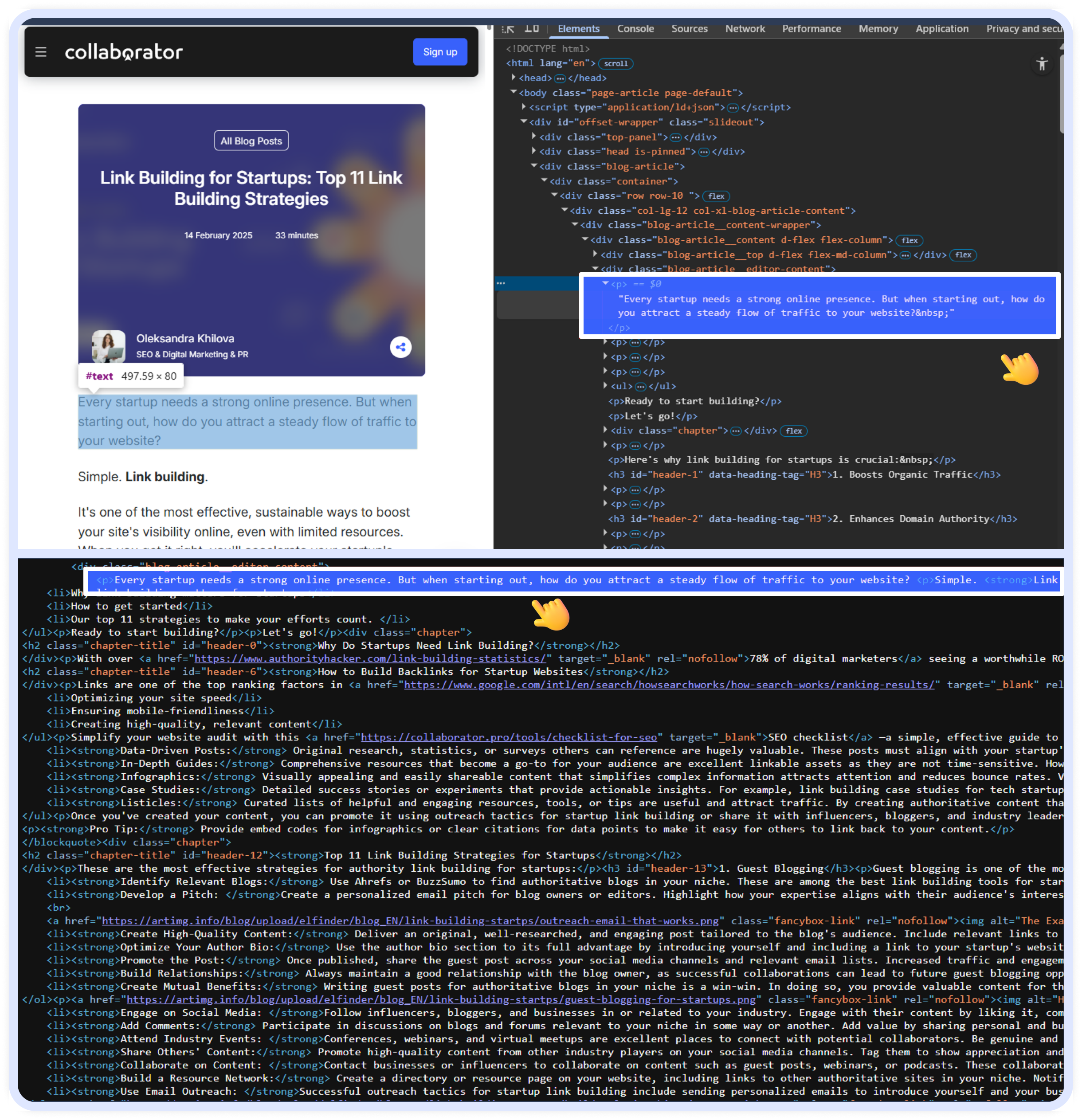 Приклад: перегляньте будь-яку сторінку блогу Collaborator, наприклад, статтю Олександри Хілової https://collaborator.pro/blog/link-building-startups. Перевірте елементи за допомогою інструментів перевірки, а потім спробуйте знайти ті ж HTML-теги, що й нас сторінці